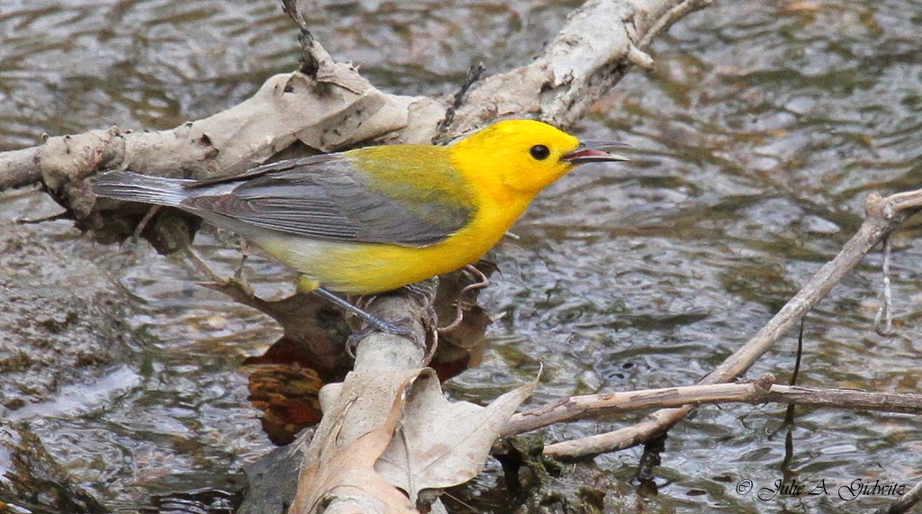 Seeking nourishment along the creek ~ Prothonotary Warbler